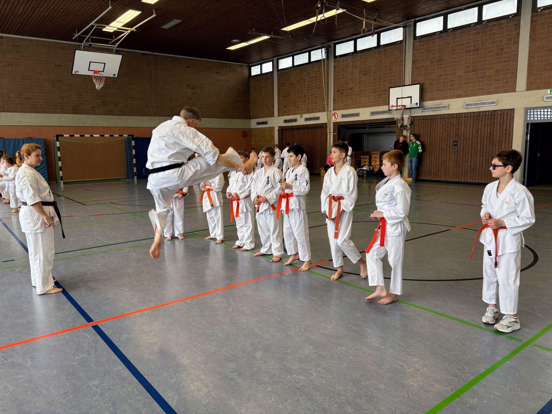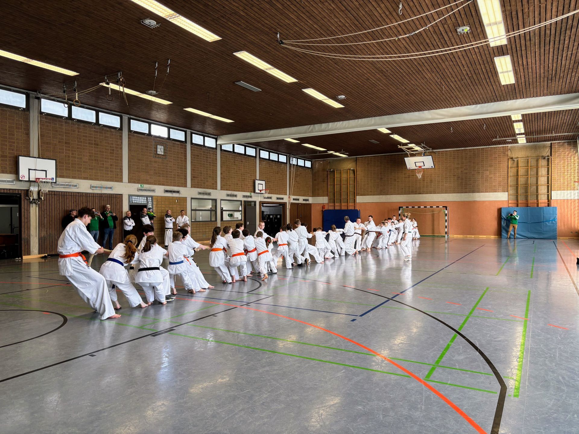 Nach einer kurzen Pause zur Stärkung mit Bananen und Riegeln folgte ein besonderes Highlight des Tages: das Kumite-Turnier. Hier konnten die Kinder erste Wettkampferfahrungen sammeln und ihr Können unter Beweis stellen. Die Spannung war sowohl bei den Teilnehmern als auch bei den Zuschauern deutlich spürbar. Für viele Eltern war es ein besonderer Moment, ihre Kinder erstmals „in Action“ zu erleben – entsprechend groß war die Unterstützung vom Rand.
